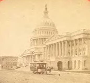 A horse drawn car passes in front of the United States Capitol Building before the turn of the century.